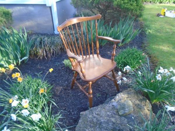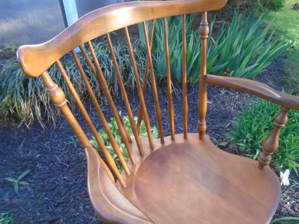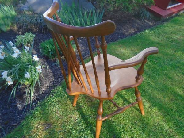 This chair is a rare example of a Theodore Baumritter/Ethan Allen. Handmade in Vermont of Nutmeg Maple. It is Vintage 1950s-1960s. It is also called a Fiddleback Windsor chair. This chair is in fine condition and very sturdy.