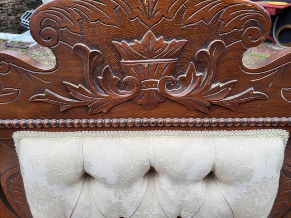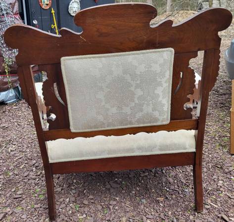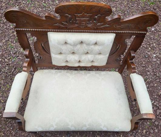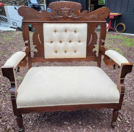 I'm selling an antique Eastlake style carved wooden loveseat or small sofa. It has cream colored Damask and tufted upholstery. Nice piece, sturdy and clean. Ready to use! Pick-up in Pennsburg. open...