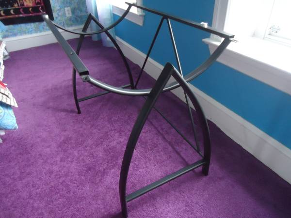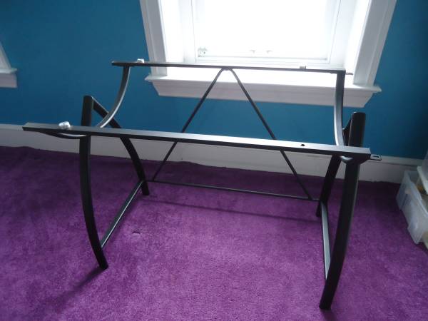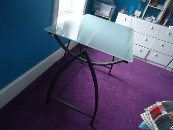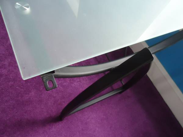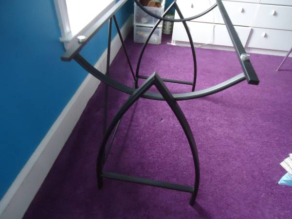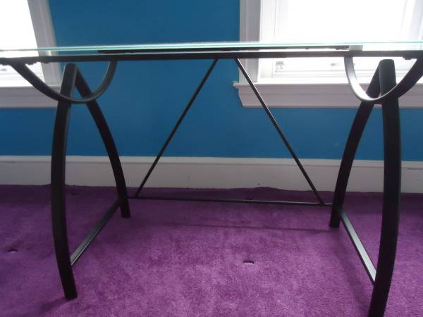 SEE THE PHOTOS FOR THE BEST DESCRIPTION. THE ALL METAL BASE USES WELDED CONSTRUCTION AND THE BLACK PAINT HAS NO SCRATCHES OR CHIPS. THE BASE DIMENSIONS ARE 37" WIDE X 19" DEEP X 29" HIGH. THE TEMPERED GLASS TOP IS 37" WIDE X 24" DEEP X 1/4" THICK. THIS IS A VERY STURDY DESK WITH A VERY COOL DESIGN. $30 - LEAVE AN E-MAIL IF INTERESTED.