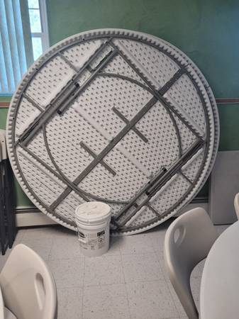 White poly round tables 6' diameter Seats 6-8 people 4 tables available Asking $120 each Or all 4 for $450 90" round tablecloths -green, ivory, and navy. 3 free with a table purchase! Call or text...