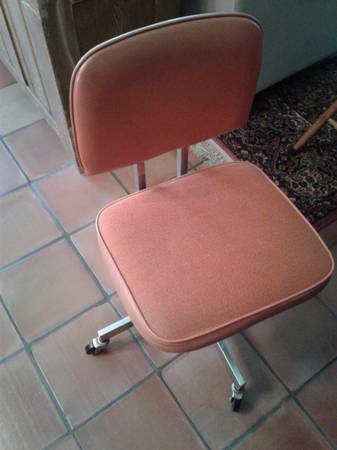 Office Chair; vintage 1970's, wheeled and chromed 4-leg design, 16-in deep by 18-in wide orange cloth and vinyl seat with backrest, approximately 3-ft high.
