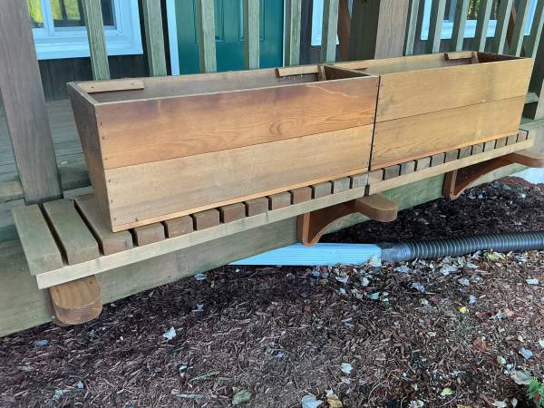 Outdoor wood shelves/brackets/planters, configure into bench/table/etc, must bring screwdrivers(hand/battery for removal, $40.00 for All, 70”L, 48”L, (2)- 39”L each, (2) planters(30” L each). Live close by rt78 exit 7, phone call or phone# in email reply, AD deleted when sold.