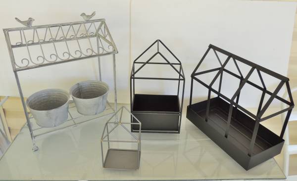 Here are 4 different house shaped open air (no glass) terrariums to show case your indoor (or outdoor plants). I used them for African Violets. But whatever your fav plant is, these speak volumes. All from different companies. Small to large, the height in inches, is to the peak of the roof:
