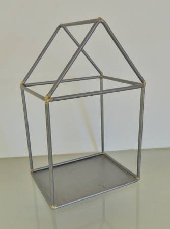 d-14x7-1/4x17-1/2H, gray metal, 2 birds on roof, two metal planters welded in place. All one piece. I found clear plastic liners for each flower pot, they are yours if you want them.