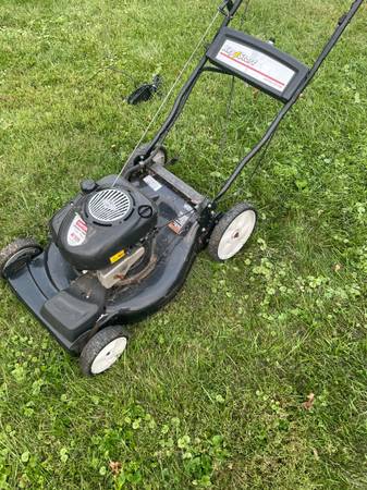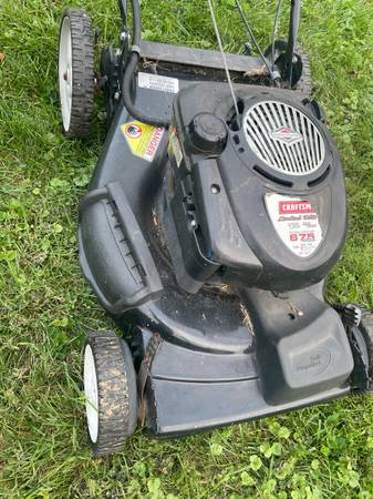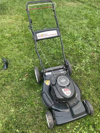 Craftsman 6.75 self propelled mower with electric start. Easy to start by either push button or with the pull rope. No priming or choking of the engine. Everything works as it should. Comes with the battery charger for the electric start as well. It only does mulching (no bag) and smokes for the first few seconds of startup.