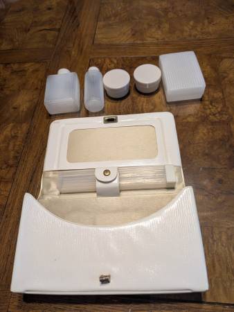 Antique toiletries travel holder with original containers. Never used. Missing mirror.