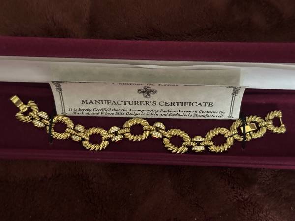 Excellent condition. Pre owned Camrose & Kross JBK Jackie Kennedy Bold Rope Simulated Ruby Bracelet is a stunning piece of fashion jewelry that pays homage to vintage style with its 24 Karat Yellow Gold Played Metal and Swarovski Ruby Crystals. The bracelet features an oval link chain with a snap closure, making it easy to wear for special occasions. With 60 gemstones and a stylish chain design, this bracelet is a perfect gift for Mother’s Day, Christmas, or Valentine’s Day. Signed by Camrose & Kross, this bracelet exudes beauty, art, and love in a timeless piece that is sure to be a standout accessory for any woman’s jewelry collection.
