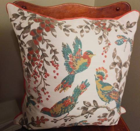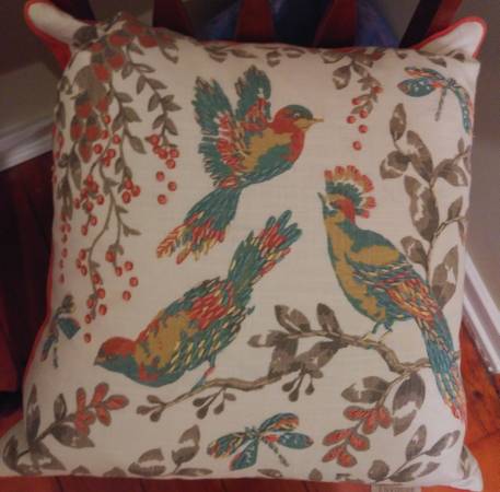 Beautiful embroidered pillow. Three embroidered Birds and a floral motif. Colors in blue, orange and grays. White background. Measuring approximately 18 by 18 in. In excellent condition.
