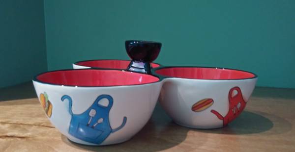 Really cute divided condiment dish. Three bowls attached with one handle. Hand-painted ceramic. This is from the clay art company. Each bowl is approximately 5 in in diameter. They are all approximately 2 1/2 inches high plus the handle. All together approximately 10 in diameter. In a home with no smoking and no pets. The dish has no cracks or scratches. It is in excellent condition.