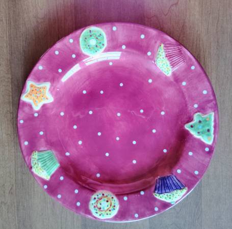 Round ceramic serving bowl measuring approximately 10 in. Lovely purple background. Cupcakes and cookies decorated around the rim of the bowl. No cracks or scratches.