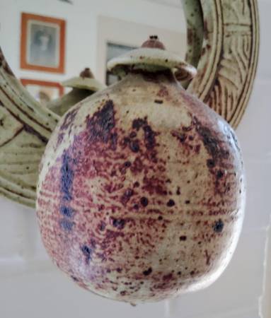 Beautifully hand sculpted pottery oil lamp. Mirror sets behind the lamp. Everything is attached. Felt backing to keep the lamp from scratching wall surface. Hole in top for hanging securely. Measures approximately 10-in wide, 11 1/2 high, and 5-in deep.