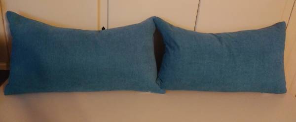 Two rectangular shaped teal colored very soft and comfy pillows. Decorative wooden buttons on the front. Measuring approximately 21 by 11 in. Like new. Barely used. Very full and soft fabric. In a...