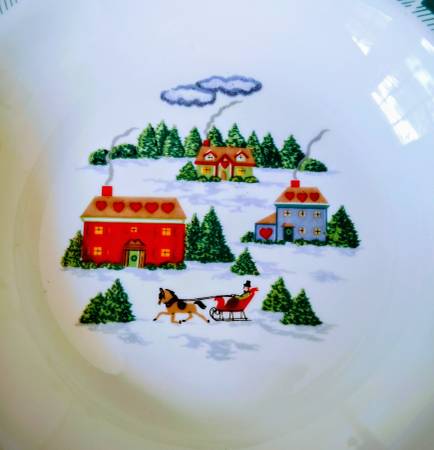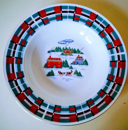 Beautiful white China Bowl with holiday scene. Winter sleigh and houses with plaid border. Like new. Measures approximately 9 in round.