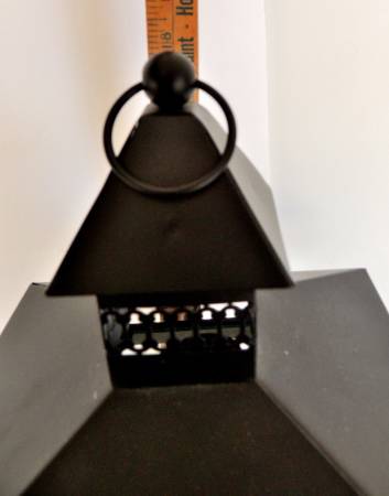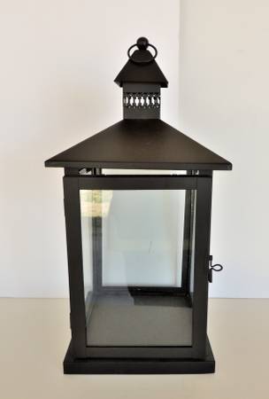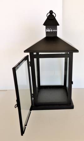 Here is a great size new black metal lantern with glass sides. Slide insert door closure. This classic shape adds to any decoration you use it for, indoor or outdoor, sit or hangs.