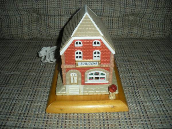 "Saloon" Hand painted ceramic body and hand made wooden base. Cut outs in windows let the soft light shine out. This would be great for a kid's room or to display on a table or dresser. Great colors and detail. Spinning wheel switch in cord for On and Off.