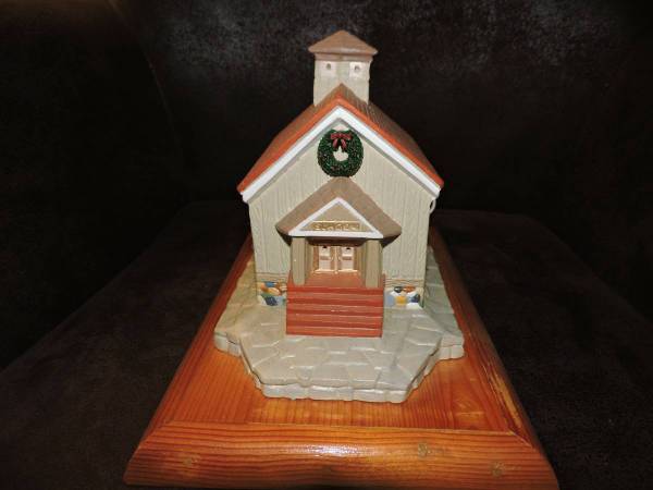 "School House" Hand painted ceramic body and hand made wooden base. Cut outs in windows let the soft light shine out. This would be great for a kid's room or to display on a table or dresser. Great colors and detail. Spinning wheel switch in cord for On and Off.