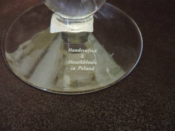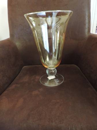 This is a beautiful Hurricane Chalice Vase that is 12" high. It is mouth blown glass which was made in Poland. The body of the vase has a pearl luster finish and the ball base is clear. Perfect condition.