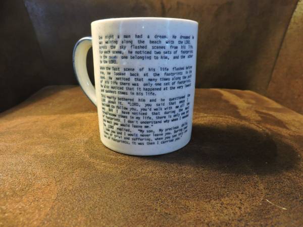 3 nice mugs. One is "These are my wonder years. I wonder where the years went?", the middle one is a beach scene from Lavallette, NJ, the third one is "Footprints in the Sand", the opposite side of that mug has the entire poem imprinted. All three are in perfect condition with no chips or cracks.
