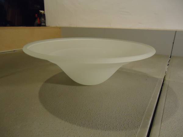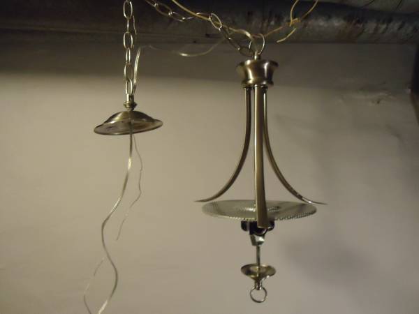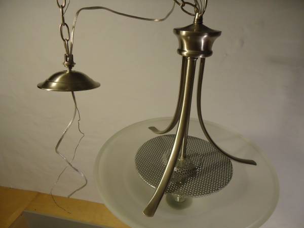 LOOK AT ALL OF THE PHOTOS TO BEST SEE THE FIXTURE WITH AND WITHOUT ITS FROSTED GLASS BOWL AND THE PAPER LABELS INSIDE OF THE TRIM COLLAR. IT IS LIKE NEW AS I DO NOT SEE ANY BLEMISHES ON EITHER TO BRUSHED NICKEL OR THE GLASS BOWL PORTIONS. IT IS 24 INCHES HIGH FROM TIP TO TIP. IT CAN HANDLE UP TO THREE 75 WATT LIGHT BULBS. THE GLASS BOWL IS 18 INCHES ACROSS AND 6 INCHES HIGH. THE CHAIN IS APPROX 25 INCHES LONG BUT CAN BE ADJUSTED BY REMOVING LINKS. THE ELECTRIC CHORD IS APPROX 40 INCHES LONG AND HAS A SEPARATE GROUND WIRE. THE PAPER LABEL SAYS IT WAS MANUFACTURED IN 2018 AND I ESTIMATE WE BOUGHT IT AT LOWES IN 2019 FOR 179.00 PLUS TAX. I JUST TOOK IT DOWN AND IT WORKED PERFECTLY BUT THE WIFE WANTED TO CHANGE IT, PLEASE DO NOT ASK WHY AS I DO NOT KNOW, I JUST SAID O.K. THIS ITEM IS GUARANTEED TO WORK OR YOUR MONEY BACK. $40 - LEAVE A CONTACT NUMBER IF INTERESTED.