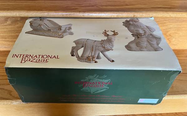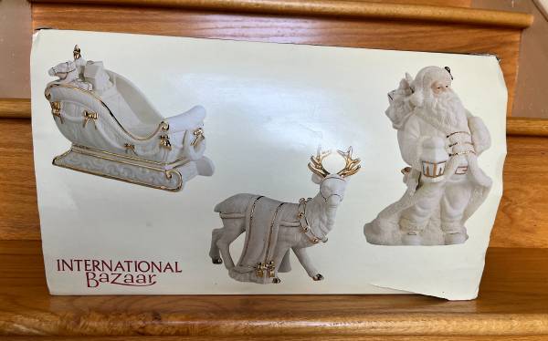 International Bazaar. Three Porcelain Figurines. Santa, Sleigh, and Reindeer. Only taken out of box for CraigList photos. Smoke free home. If interested, please contact me; enter posting title into...