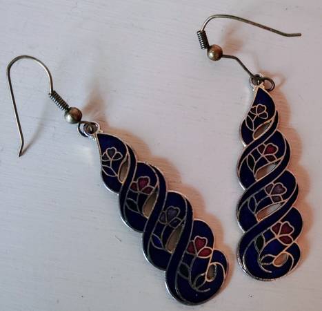 Beautiful gold, blue and red cloisonnee pierced earrings. They are approximately 1 1/2 in long. In excellent condition.