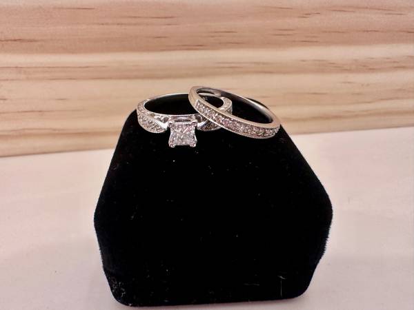 This stunning bridal set includes a princess-cut diamond engagement ring and a matching diamond wedding band. Both are 14K white gold, size 9, and have a beautiful sparkle with timeless detailing.