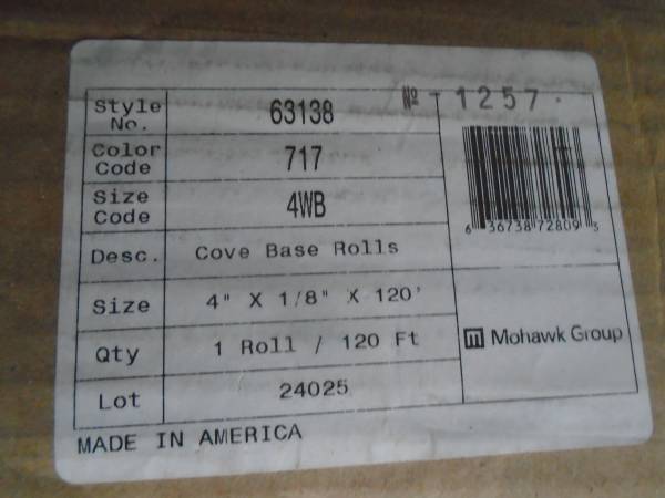 Full unused roll, USA made, Mohawk (120 LF) 4" x 1/8" x 120 ft, dry back. White. (Cost new was $125/roll) Call and leave a message or text. No email.