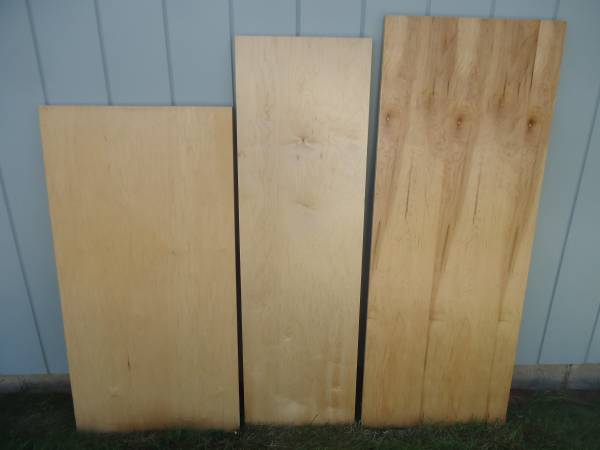 CABINET GRADE PREFINISHED 3/4" MAPLE PLYWOOD. THE FINISH IS EXTREMELY DURABLE AND WILL LAST A LONG TIME.THE DIMENSIONS LEFT TO RIGHT 1) 48" X 24 1/2" X 3/4" 2) 56 1/2" X 17" X 3/4" 3) 59" X 22 3/4" X 3/4' . ALL THE PIECES ARE CLEAN, STRAIGHT, AND FLAT. I TOOK PHOTOS OF BOTH SIDES TO SHOW THE GRAIN AND COLOR OF EACH SIDE SO LOOK AT ALL OF THE PHOTOS. $60 FOR ALL THREE PIECES. LEAVE A CONTACT NUMBER IF INTERESTED.