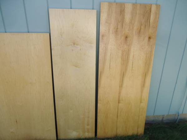 CABINET GRADE PREFINISHED 3/4" MAPLE PLYWOOD. THE FINISH IS EXTREMELY DURABLE AND WILL LAST A LONG TIME.THE DIMENSIONS LEFT TO RIGHT 1) 48" X 24 1/2" X 3/4" 2) 56 1/2" X 17" X 3/4" 3) 59" X 22 3/4" X 3/4' . ALL THE PIECES ARE CLEAN, STRAIGHT, AND FLAT. I TOOK PHOTOS OF BOTH SIDES TO SHOW THE GRAIN AND COLOR OF EACH SIDE SO LOOK AT ALL OF THE PHOTOS. $60 FOR ALL THREE PIECES. LEAVE A CONTACT NUMBER IF INTERESTED.