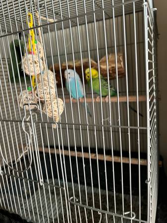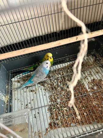 Blue female green male do fly freely in home leave them in cage for 2 months to get used to environment and than let them fly they do go back into the cage they are good with handlers cage included with accessories and large jar of bird food. There is a rehoming fee.