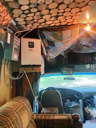 Two backup cameras installed (one up high and one on the bumper). Screen is powered by 12v cigarette outlet. One hard wired overhead light in front of bus. Installed this all-in-one off grid solar kit: