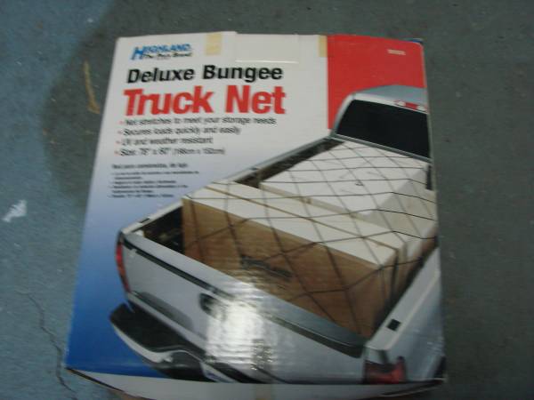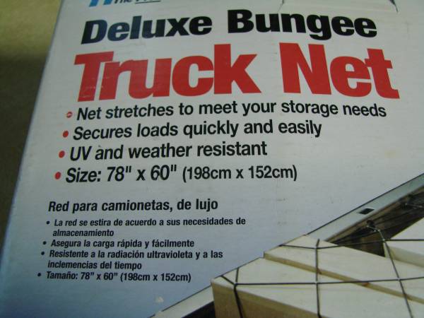 This Highland (the pro’s brand) deluxe bungee truck net is made by Joubert. It will Safely secure cargo in the back of your pick-up truck Measures 60 inch X 78 inch. Includes net, mounting hardware & instructions. The Package Dimensions: Measures 3 inch in width, 13.75 inch in length and 9.75 inch in height.