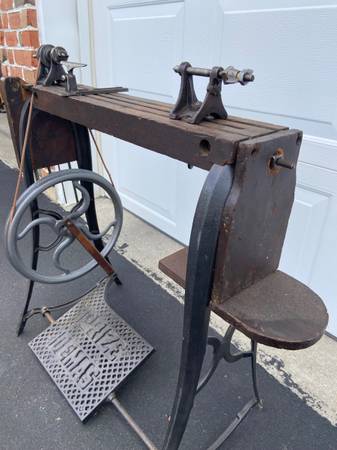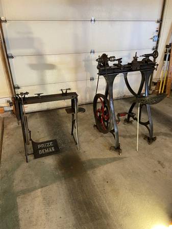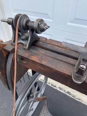 Wood lathe made by Prize Demas. This is a real working treadle lathe in small size made to be used by children. A very interesting piece of history and a great conversation piece. In the late 1800’s, early 1900’s an 8 or 9 year old would have spent their day at work on this machine. Show children what their lives would have been like in a different time. The last picture shows the lathe to the left of an adult size lathe.