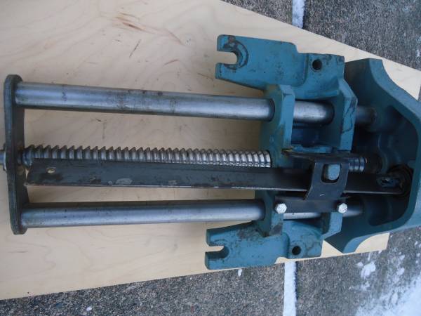 SUPER CLEAN AND OPERATES SMOOTHLY THE ENTIRE SPAN. IT ALSO HAS A QUICK-TRIP LEVER THAT ALLOWS THE JAWS TO OPEN AND CLOSE FREELY UNTIL THE LEVER IS RELEASED. IT OPENS TO A MAXIMUM OF 9 3/4 INCHES. THE JAWS ARE 9 INCHES LONG AND IT HAS A THROAT DEPTH OF 3 INCHES. HAS A BENCH DOG THAT THE ORIGINAL THUMB SCREW HAS BEEN REPLACED WITH A REGULAR BOLT WHICH WORKS JUST FINE. CHECK OUT ALL OF THE PHOTOS FOR THE BEST DESCRIPTION. COMES WITH THE 4 LAG BOLTS AND WASHERS TO MOUNT IT TO YOUR BENCH. THIS THING WEIGHS 25 POUNDS AND IS VERY SOLID. MADE IN TAIWAN IN THE MID 1990'S. $45 = LEAVE A MESSAGE IF INTERESTED.