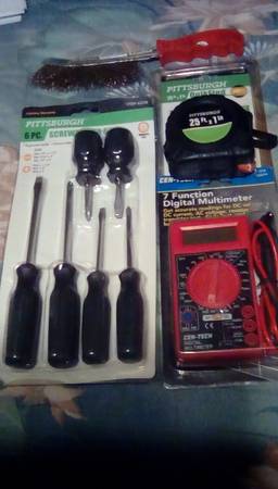 Tape measure 25'x 1" , 7 function Muti-meter reads AC and DC voltages and currents plus Ohms & other things, Wirebrush. NEW in packages. Make Great Gifts. $9.00 For all. Will sell items by...