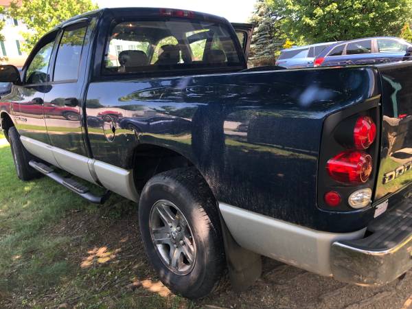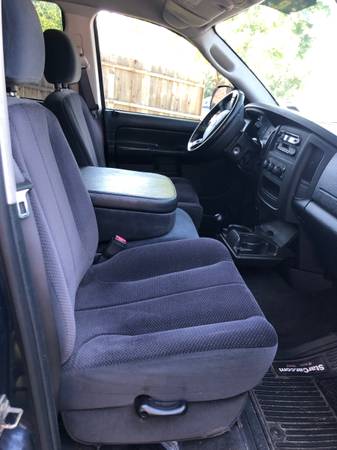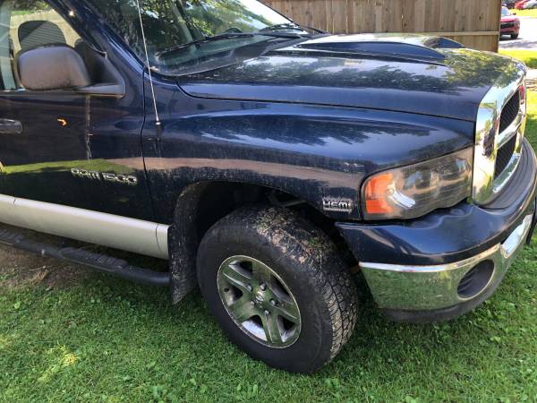 2004 Dodge Ram 1500 5.7 Liter Hemi, 4x4, 198,xxx miles. Power windows, power locks, power mirrors, power brakes, tow hitch, ice cold A/C, cruise, tilt. Typical rust rocker and part bed. Has cracked dash, small hole in driver seat. Back seat flips up for storage. Rear of interior good shape. Rhino lining in bed.