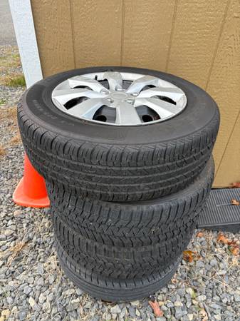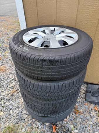 F/S Set of 16” Oem Subaru steel wheels and tires. Great set for the Winter months. Lug Pattern 5x100. Tire Size 205/65R/16. 2 tires are Bridgestone Snow tires and other 2 are all season. $120 takes the set. 4 Hubcaps included. Call/text 57O/995/O570 if interested. Pick up location Saylorsburg PA 18353 or Kresgeville PA 18333.