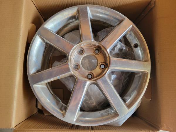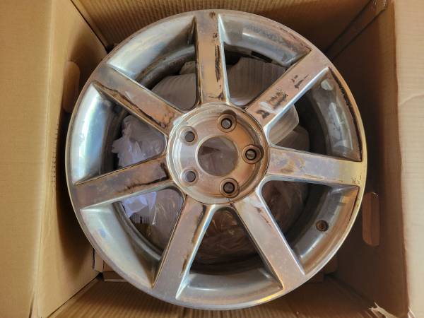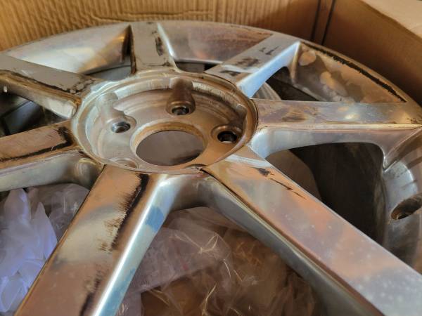 Mostly just dusty and need washed. One rim has rub from a tire that should easily buff off. Very small amount of cosmetic rash. Otherwise in good condition.