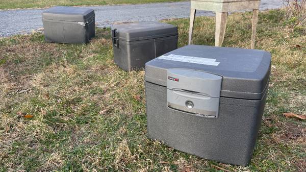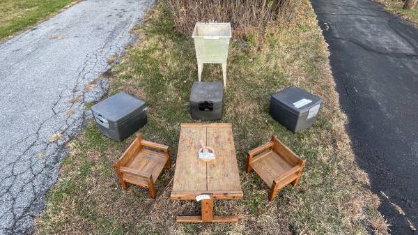 Located at curb of 3963 Werleys Corner Road, Kempton, PA, 19529 (approx. 4 mi. from New Smithville Sheetz). Kids wooden play table with two wooden chairs. Three fire safes. Two have duct tape where...